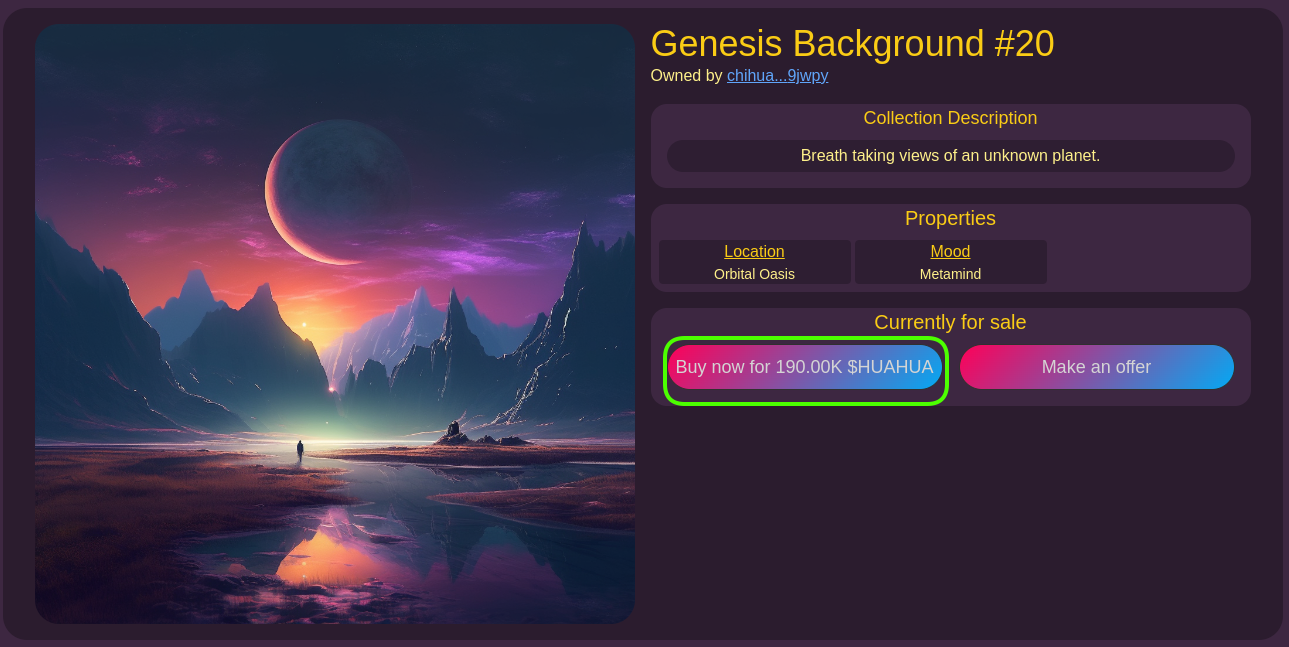 * Then you will be redirected to the NFT's page as shown in the image below. To purchase the NFT, click on "**Buy now for...**" (highlighted in green below). This action will initiate a blockchain transaction, deducting the required amount of tokens from your wallet and transferring them to the seller. Additionally, the NFT will be sent to your wallet.
