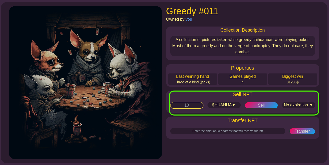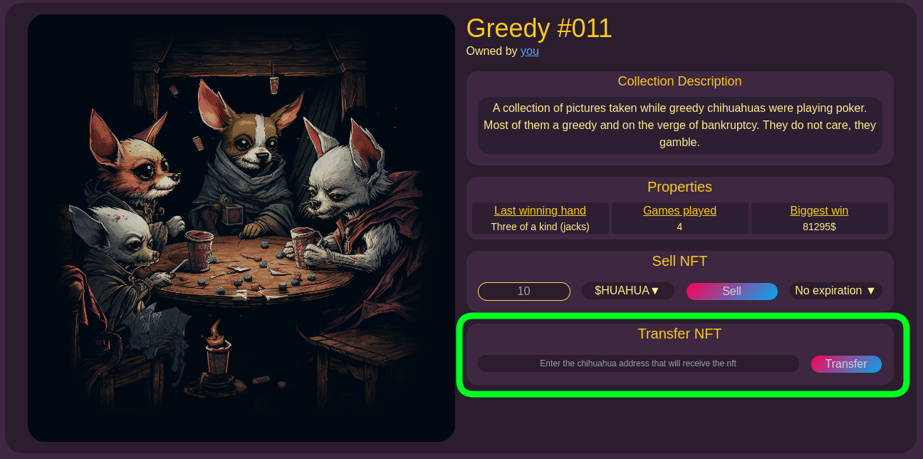 * If you simply want to transfer an NFT to another wallet, you can do so by entering the correct wallet address in the "**Transfer NFT**" section. After entering the recipient's wallet address, click on "**Transfer**". This action will send the NFT from your wallet to the specified recipient. It is important to ensure that you have entered the correct recipient's address before initiating the transfer.